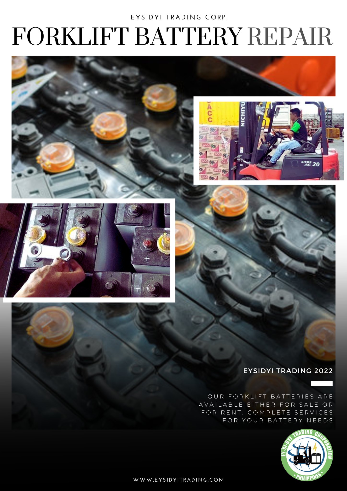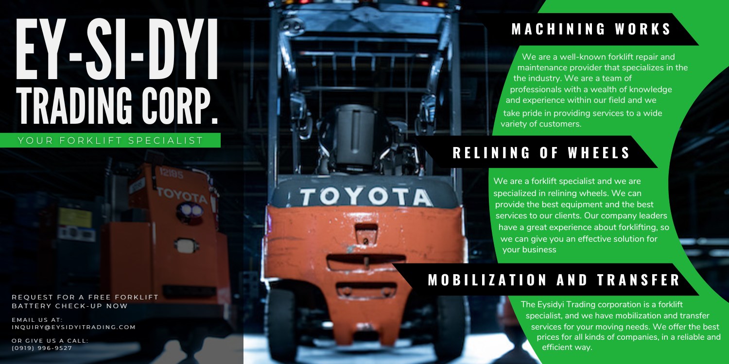 EY-SI-DYI Trading Corporation is a leading supplier of traction batteries, serving vital sectors such as logistics, manufacturing, and various industrial companies. They specialize in providing brand-new and fully reconditioned batteries, along with a comprehensive range of battery parts and accessories. Their services extend to battery recycling, general replating, replacement of defective battery cells, and on-site battery testing, repair, and installation. Additionally, they offer expert service and repair for forklifts, supplying both original and replacement parts.
