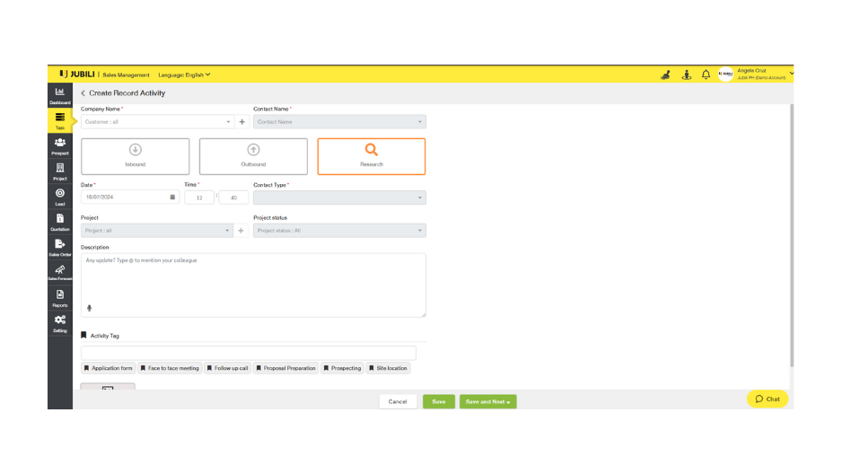 Jubili’s TASK feature now includes Inbound, Outbound, and the newly added Research tasks. This categorization helps sales teams organize their activities more effectively:
